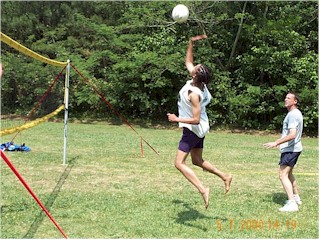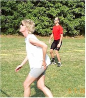 We played from 1 pm to about 6:30 pm at Blackburn Park. A great time was had by all. We had 9 people and two nets. We played mostly doubles, but finished off with two games with three women vs. three men, on a women's net. The women edged out a win on both games. |