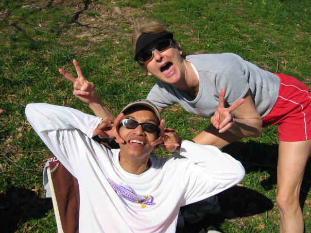 Karen Stewart and Cathy Smith, giving the "V for Victory" sign to